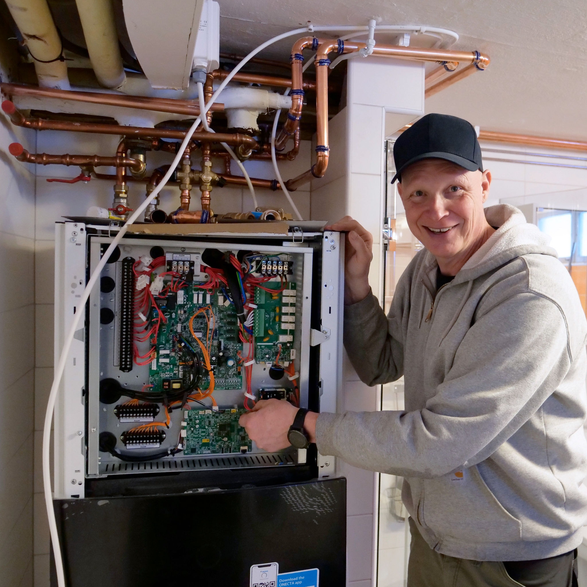 Installatörerna Jalle och Stefan stod för arbetet, från demontering av den gamla pumpen till rördragning och platsanpassning av den nya. Mattias, som älskar att bygga och lösa problem, var gärna med och hjälpte till.